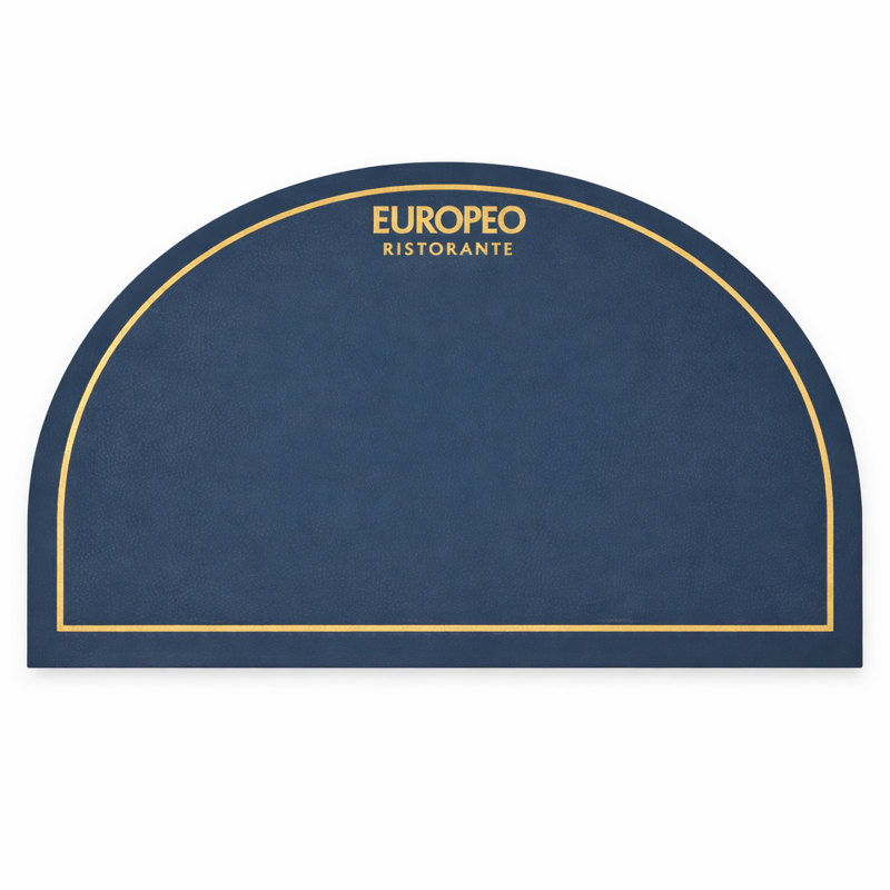 Tovaglietta in ecopelle blu, personalizzata con stampa effetto oro, ideale per ristoranti, bistrot e locali che desiderano un’immagine curata e distintiva.