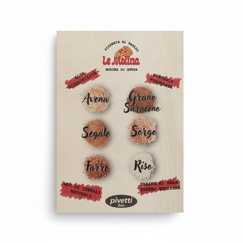Ideale per pizzerie, ristoranti e locali food, è perfetto da esporre all’interno del locale per raccontare al cliente la filosofia del prodotto e le scelte che rendono l’impasto unico e altamente digeribile.